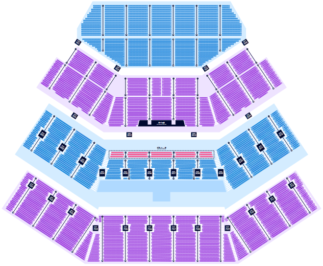 アリーナ席は1~34列、下手から席番号が1,2,3,…と割り振られており、席番号1~20, 21~40, 41~60, 61~80, 81~100, 101~120, 121~140(61~80番が中央)の7ブロックに分かれています。